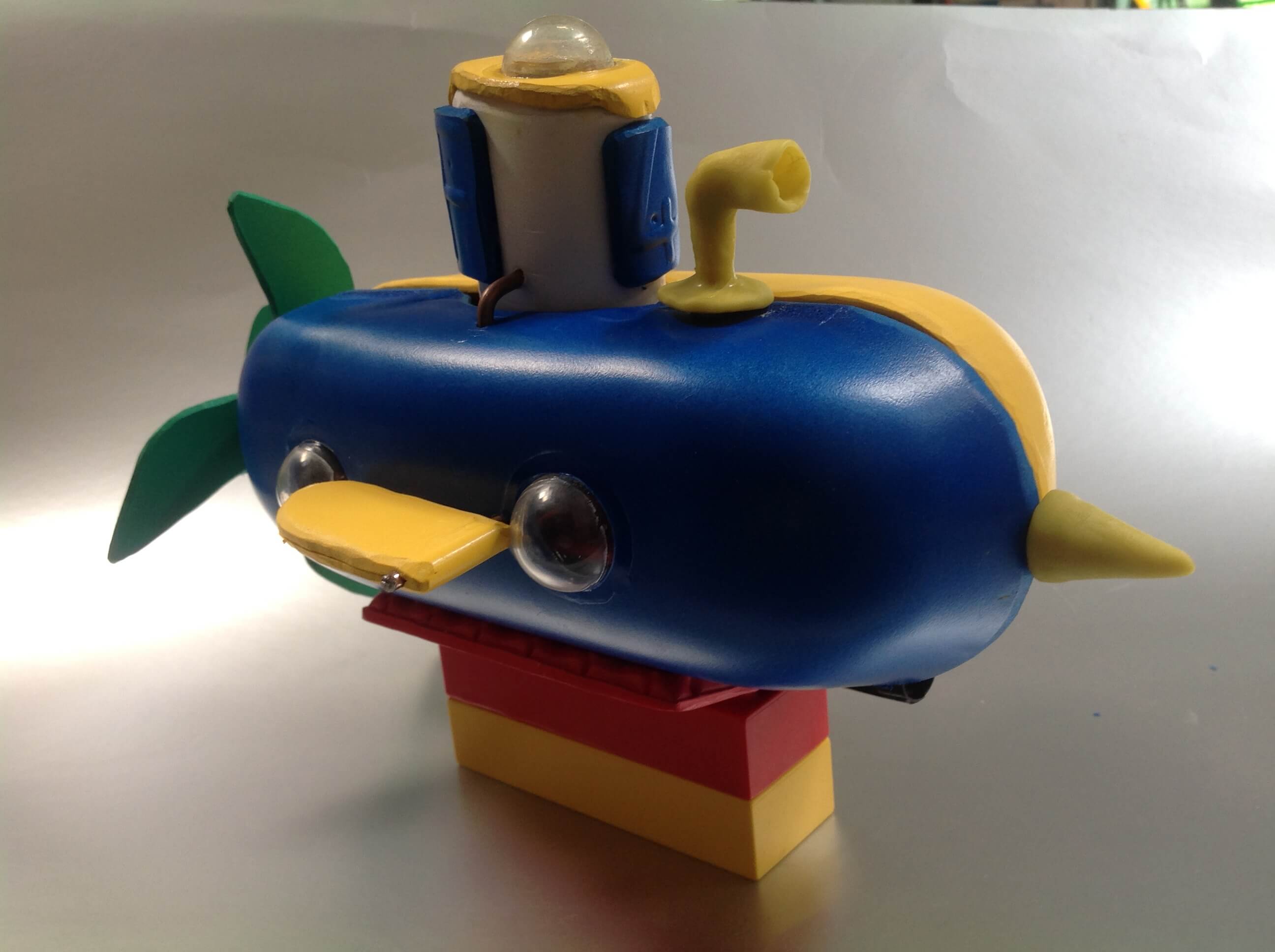 Bath toy submarine which can be opened to allow Octonaut characters to be placed inside. moving propellor, periscope, and aquaplanes. Foamex, a form of PVC was used for the main construction. Attaches to lego pieces at base.