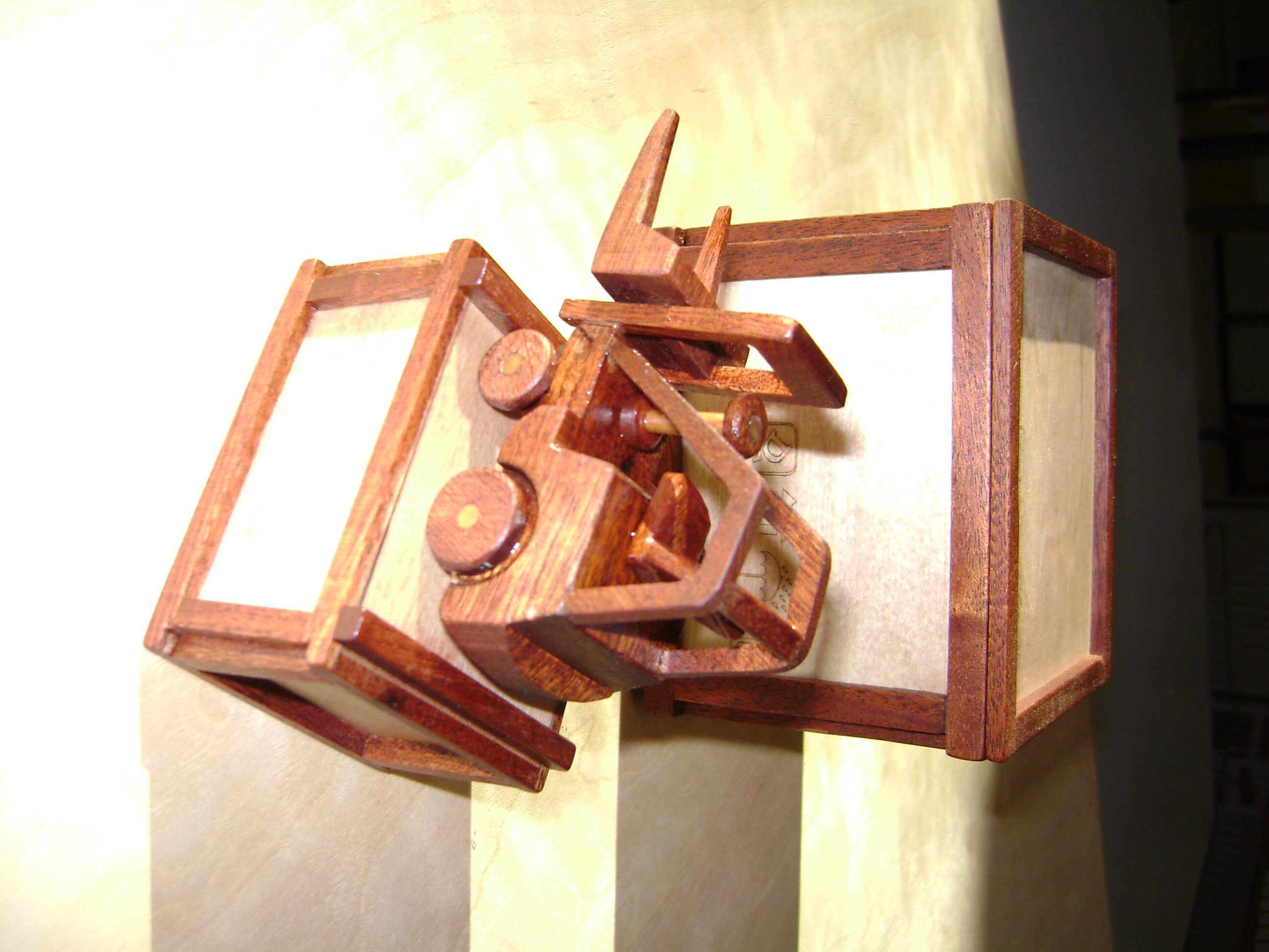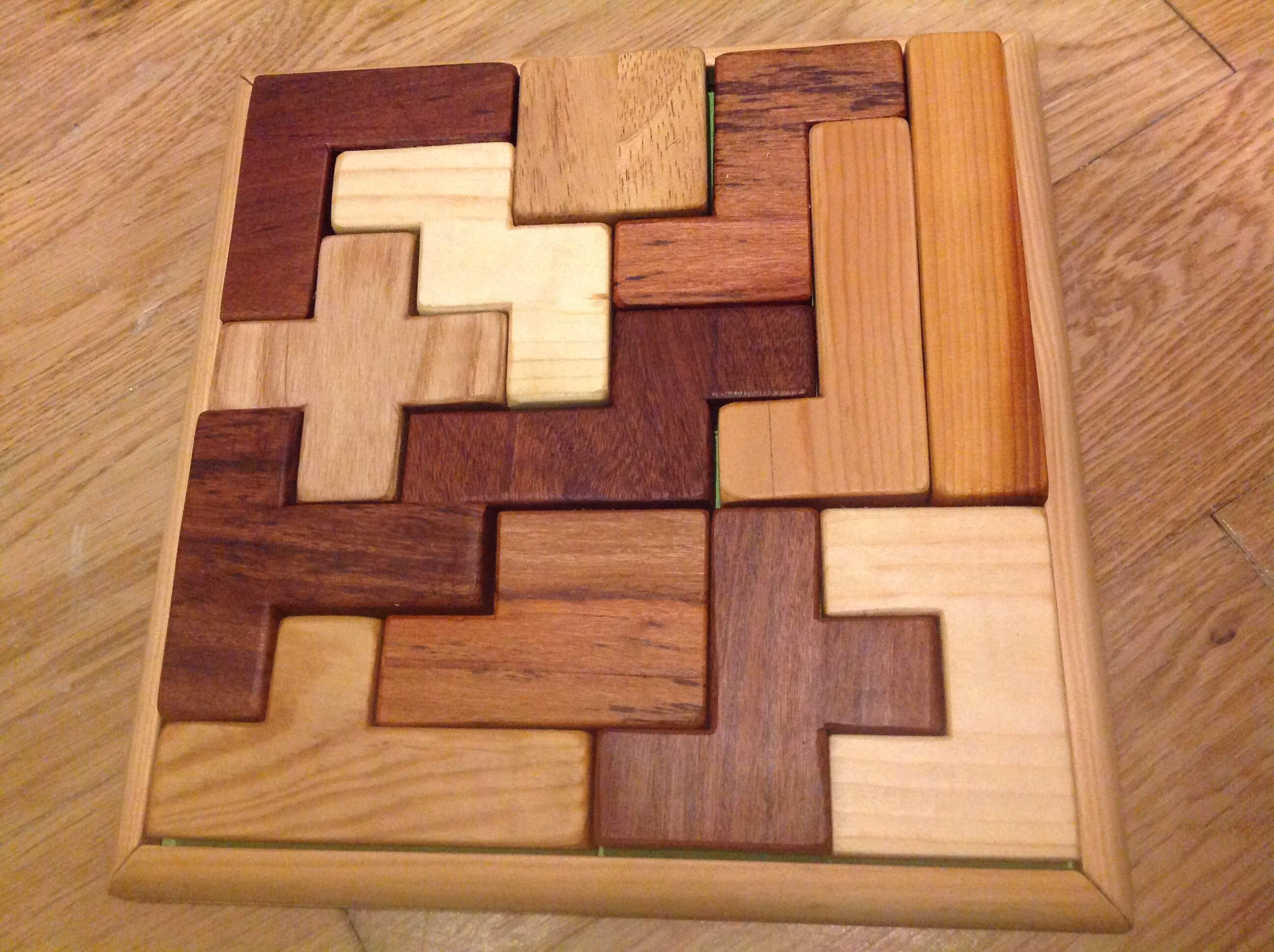 Wooden puzzle made from wood offcuts including pine, yew, mahogany and ash.