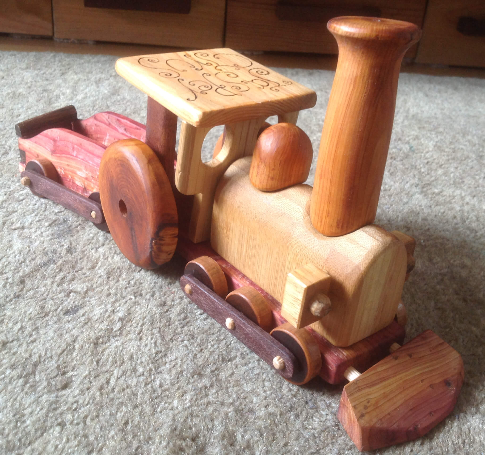 Steam train made from assorted woods for 5year old's burthday present. All parts undo to allow rebuilding.