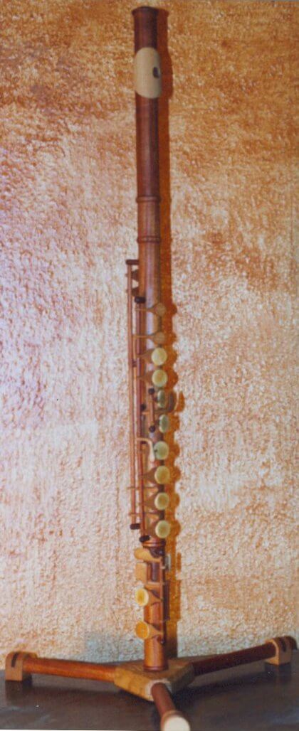 Flute sculpture made from wood offcuts including mahogany, and beech. Life size.