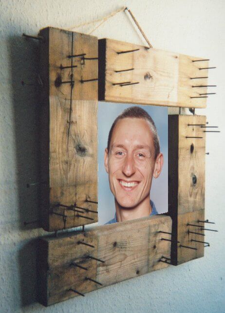 Picture frame made from recycled wood and nails.