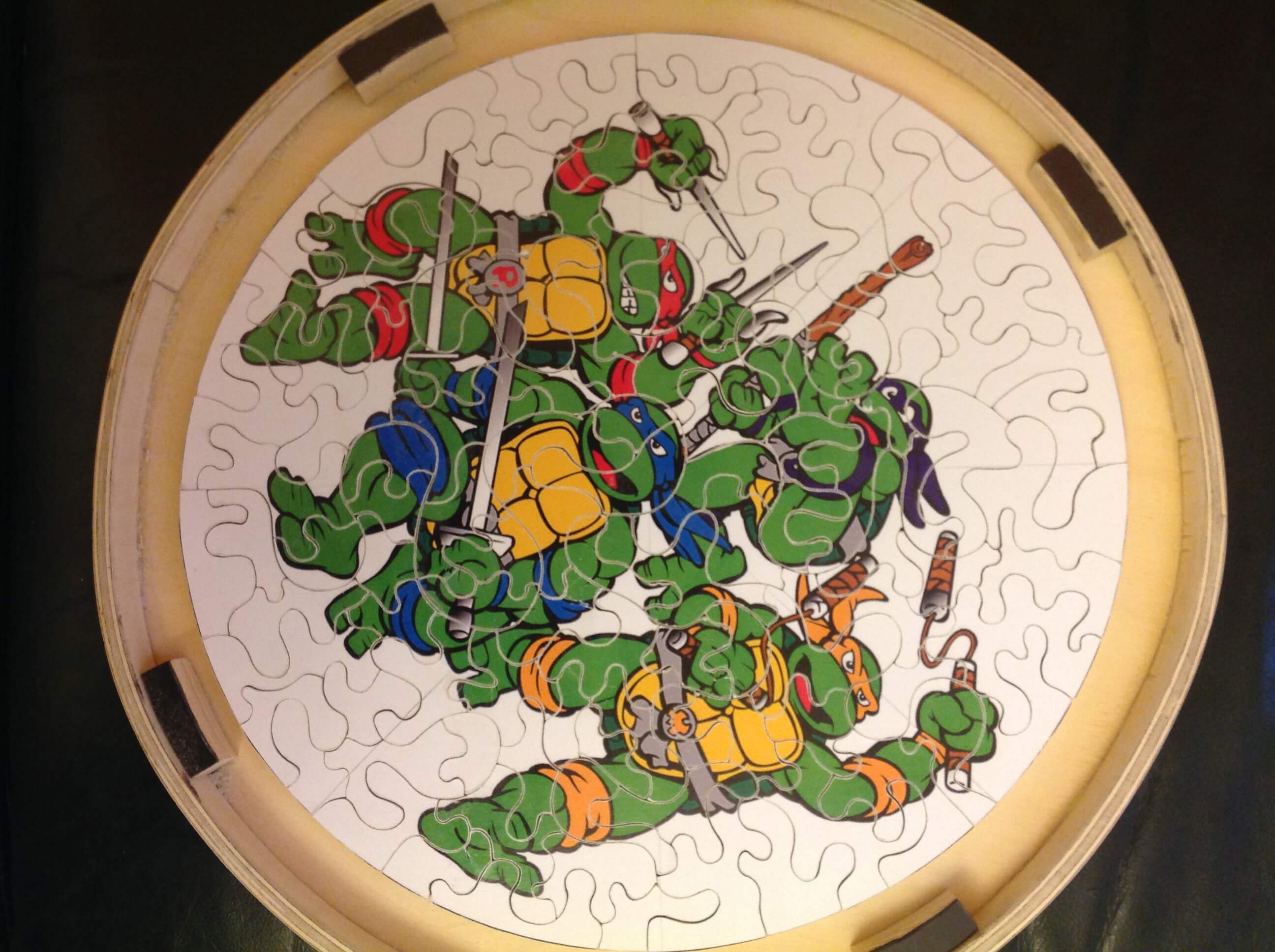 Jigsaw puzzle made in birch plywood with laminated ply circular lidded tray.