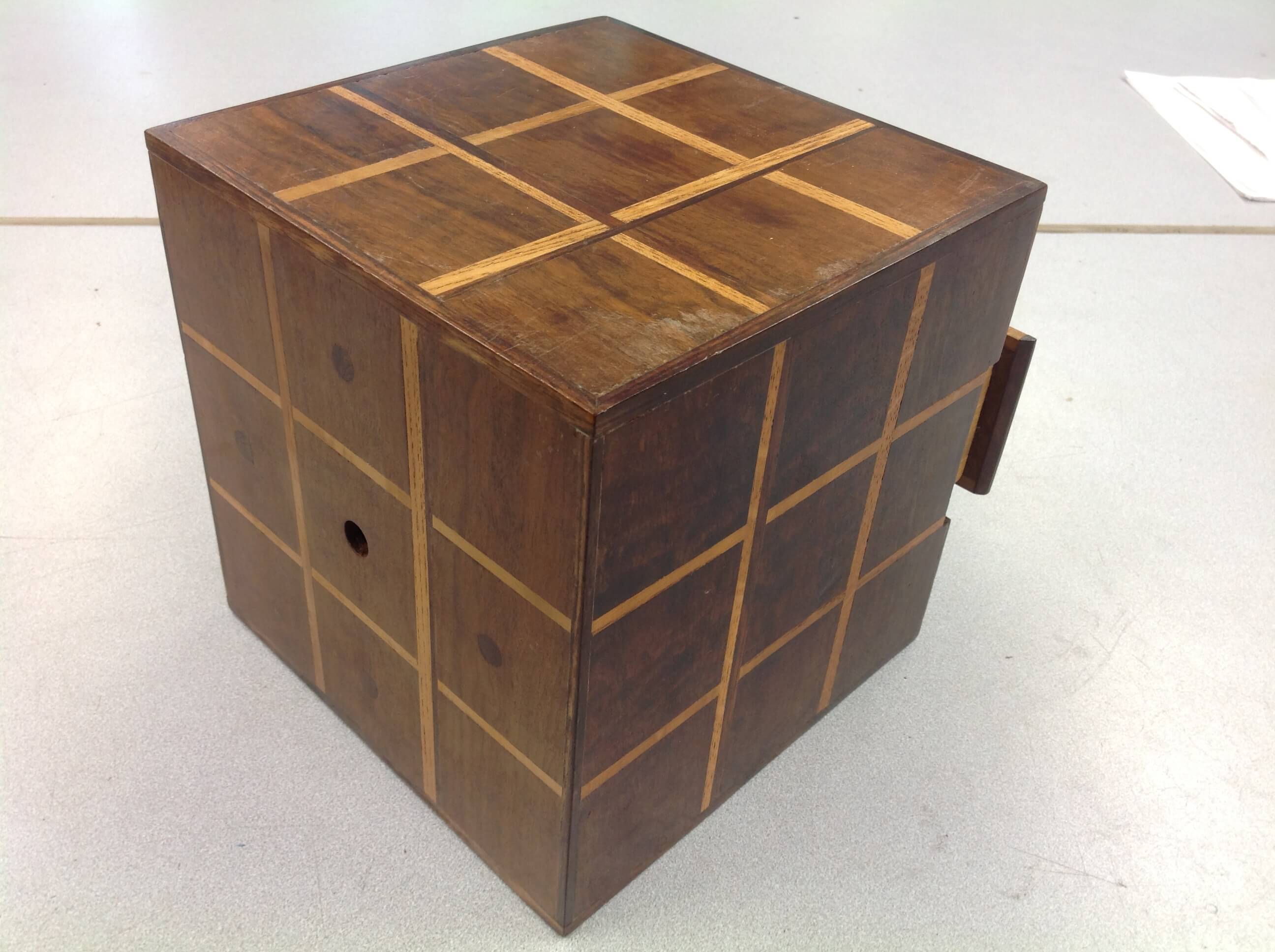 Walnut Rubik Cube based clock with inlaid rosewood and oak inserts. "Hidden" Drawer in rear with finger joints. Inlaid marks for 12 3,6 and 9 positions.
