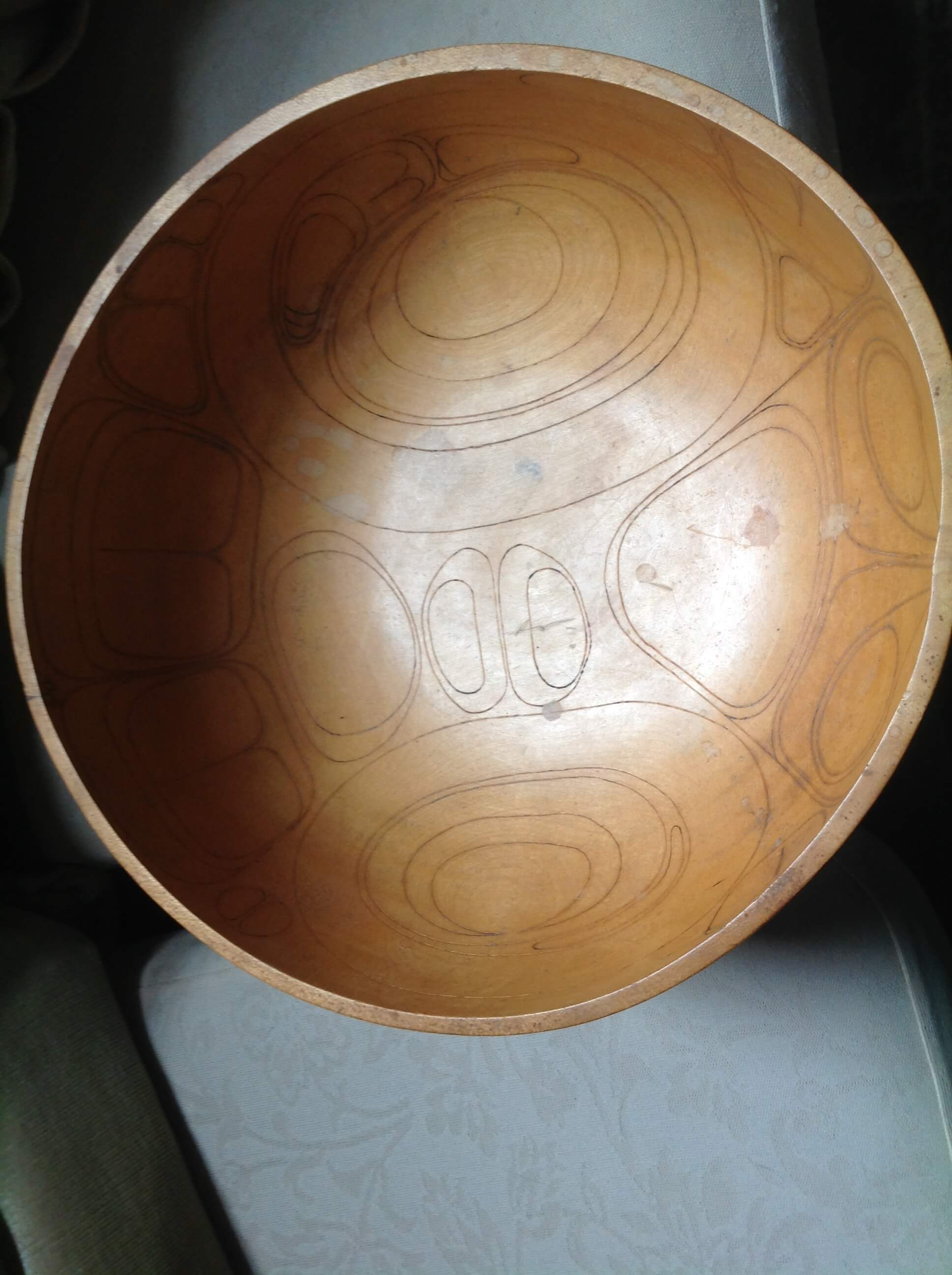 Pine woodturned bowl made from newly felled wood in 1987 storm. Decorated with West Coast Indian American art style.