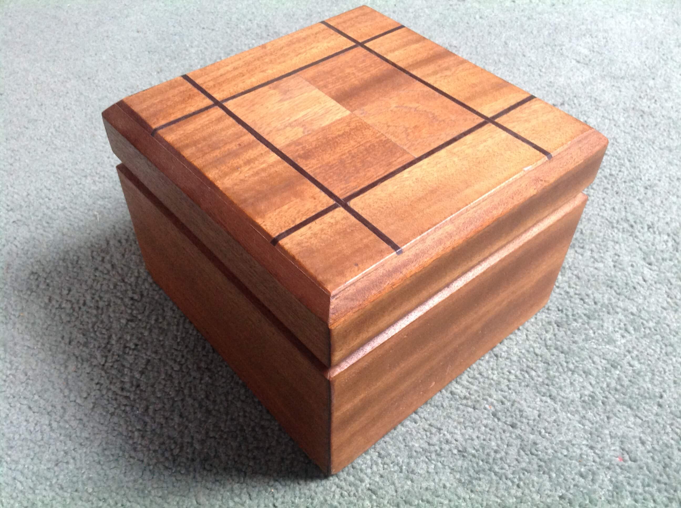 Chessmen Box made from tropical hardwood with rosewood inlay. Mitred joint construction with Beech interior.