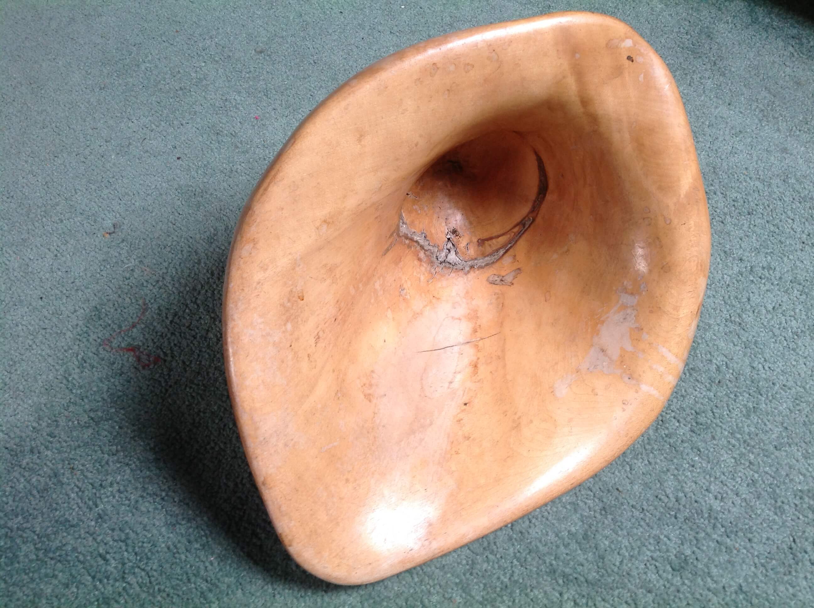 Lime carved bowl made from newly felled tree from 1987 storm. Embedded soil was discovered inside the wood, which represented growth over a missing limb.