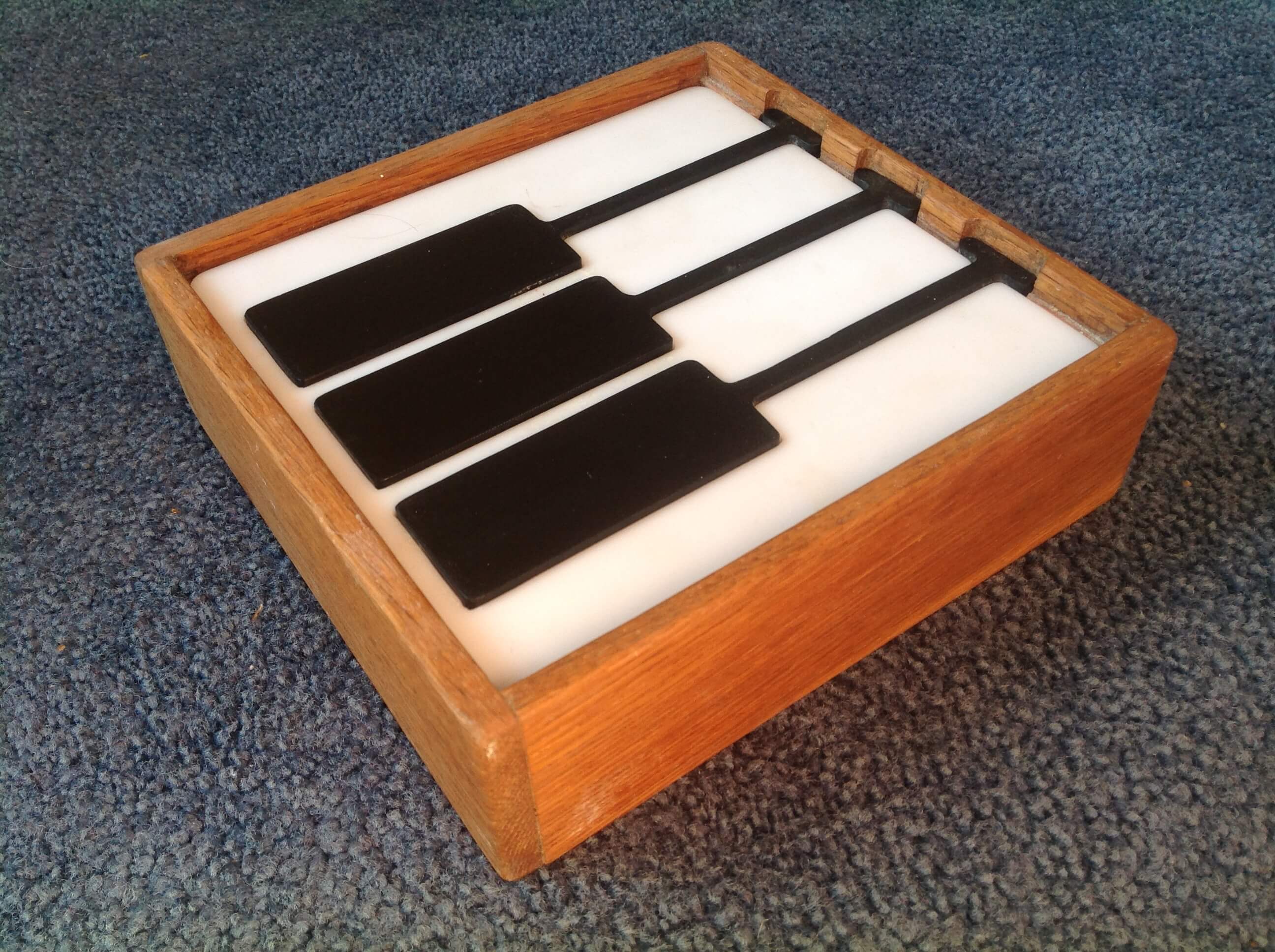 Jewellery box made from Oak and acrylic for a wedding present for pianist and trumpeter. Black acrylic is used for the trumpet valves - these cover separate compartments.